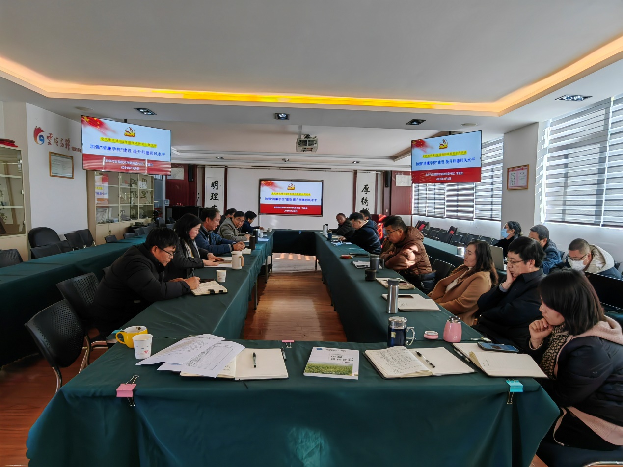 为贯彻落实党的二十大精神和中共中央《关于加强新时代廉洁文化建设的意见》精神,按照校纪委《关于组织参观廉洁文化园和廉润云农清风正扬主题展览的通知》要求,进一步落实《中共云南农业大学委员会关于印发深化推进“清廉学校”建设系列行动工作方案的通知》精神,结合学院参观学习廉洁文化园和“廉润云农清风正扬”主题展览情况,1月8日,院党委理论学习中心组(扩大)以“加强清廉学校建设提升师德师风水平”为主题开展2024年第一次集体学习会议。会议由党委书记李富生主持,党委委员、领导班子、各党支部书记、各系、所、中心和部门负责人参加学习。