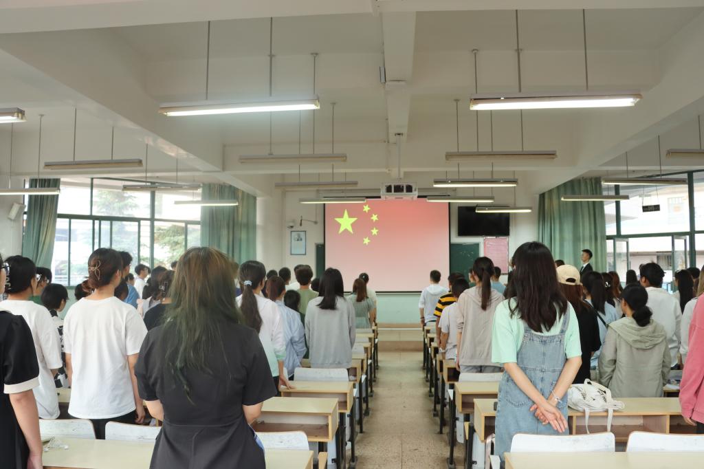 比赛开始前,全体成员庄严肃立,奏唱中华人民共和国国歌。此刻,所有人注视着鲜艳的五星红旗,党的二十大精神仿佛在我们耳边回荡,我们始终坚信在中国共产党的领导下,新中国的伟大复兴梦终将实现,赤色的旗帜将永远在空中飘扬。