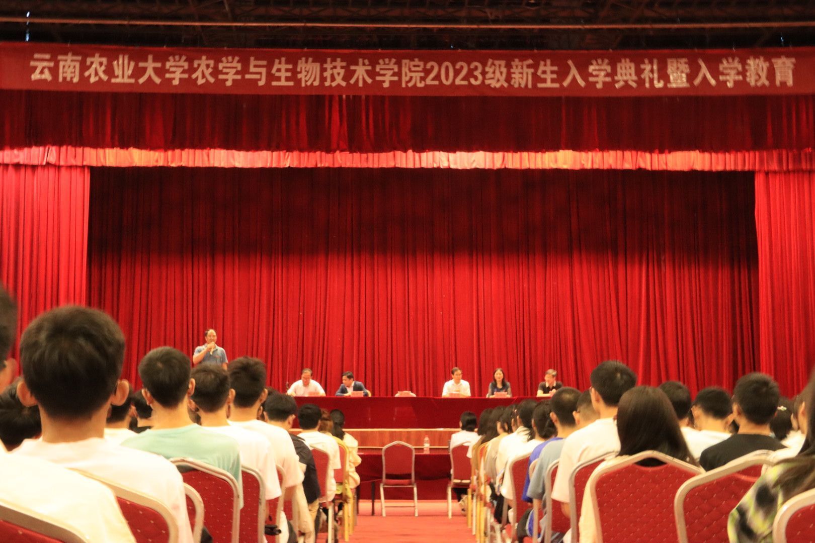 老生代表2020级药鉴班陈克林同学分享了自己三年来的大学生活,并对2023级新生提出一些学习建议。希望大一新生以饱满的精神态度,严谨的学习作风,完成自己的学业。 新生代表2023级生物技术2班张祎同学代表全体新生登台发言,表达了对进入云南农业大学开始大学学习的美好憧憬。她号召全体新生在享受大学美好生活的时候,更多地思考并关注自身未来的目标和方向。