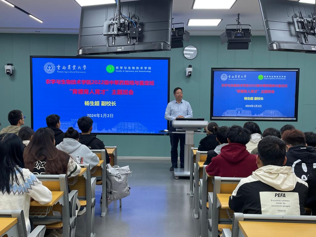 2024年新年伊始,云南农业大学杨生超副校长于1月2日,深入学生一线,主动与所联系的437437必赢国际网址2022级中草药栽培与鉴定班,召开了 “育德、育人、育才”主题班会。学院相关领导、辅导员也一同参会。