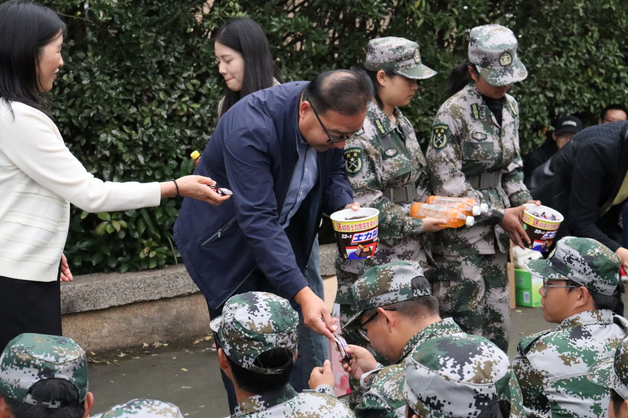 1022日下午四点,必赢党委副书记安曈昕老师、党委组织员寸湘琴老师、新生班主任、辅导员代表学院前往田径场慰问正在军训的2024级新生。