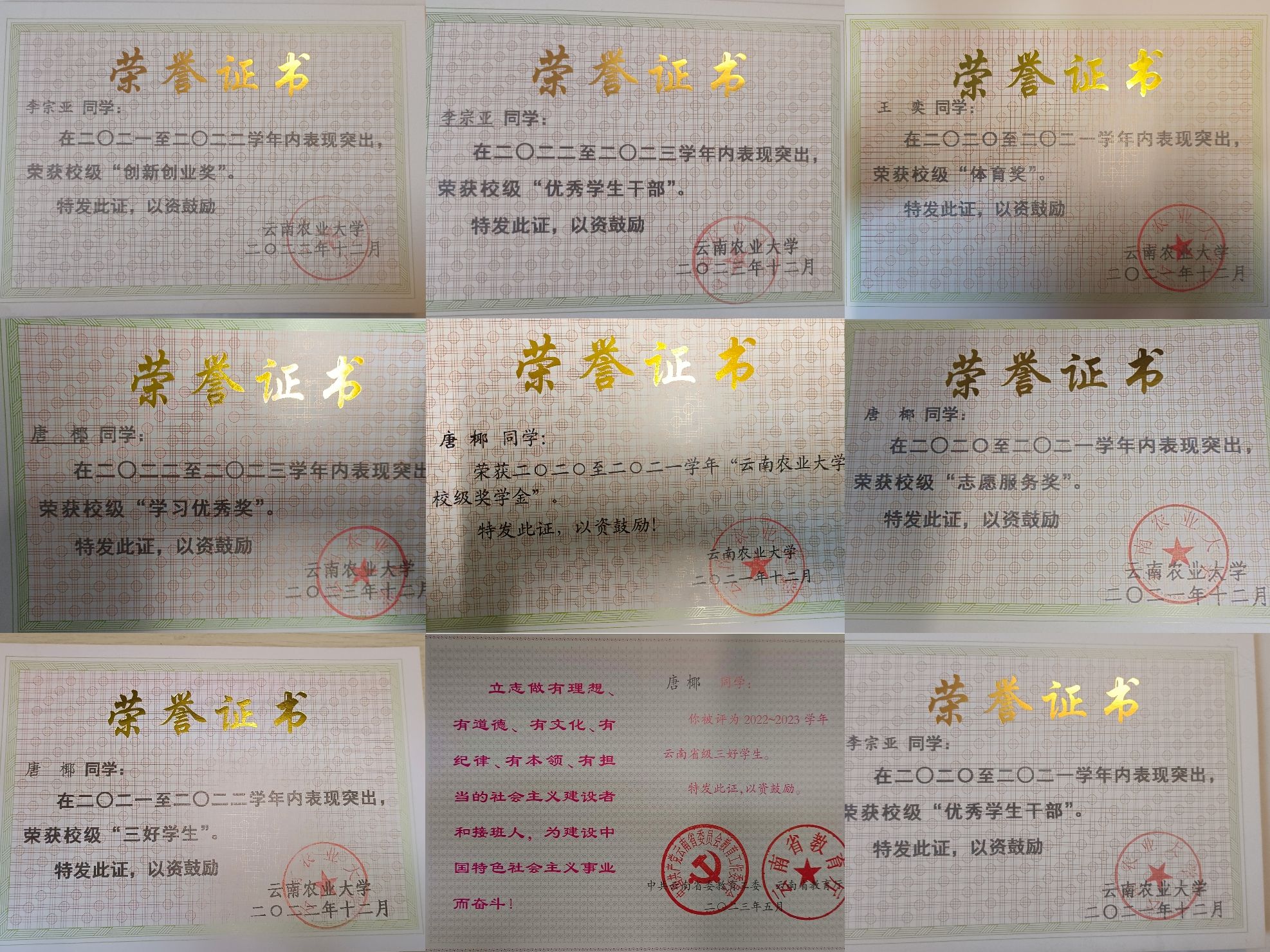 这6位同学的成功绝非偶然,而是勤奋刻苦、善于思考、善于总结、怀抱热情的必然结果。三年多来,她们以优异的表现赢得了众多荣誉,曾先后获得省级优秀毕业生、省级三好学生、国家励志奖学金、校级志愿服务奖等称号。她们不仅注重知识的积累,更注重能力的培养。通过积极参与各类课外活动,她们在云南省第十届"挑战杯"竞赛中获得省级铜奖,在第八届云南省"互联网+"大赛中斩获省级银奖,还获得了校级单项体育奖等荣誉。此外,2人通过了国家英语六级考试,4人通过了国家英语四级考试。