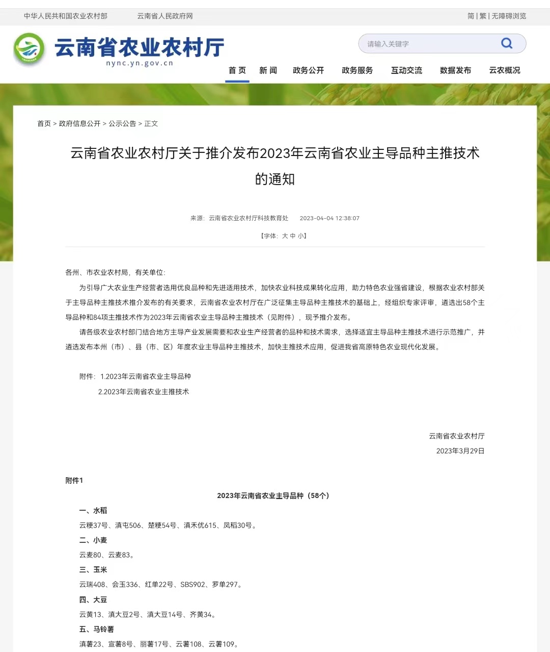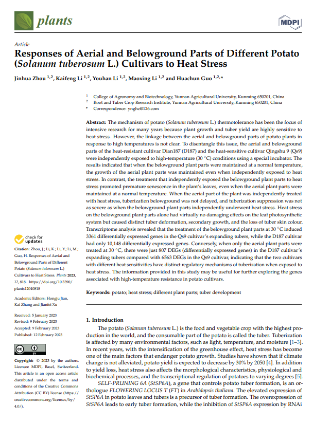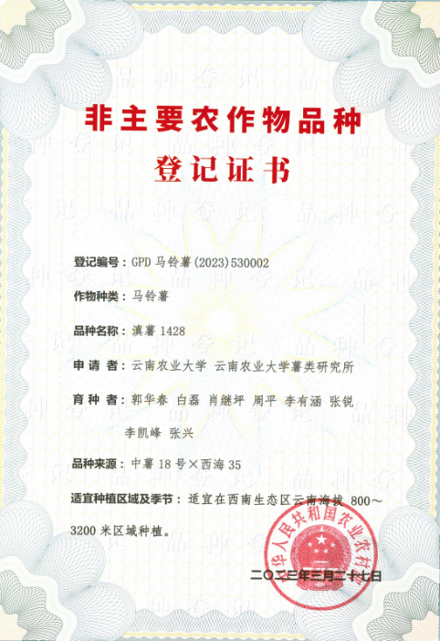 我校薯类生理生态与种质创新团队在国家马铃薯产业技术体系、省科技厅、农业农村厅和学校的支持下潜心研究,新年伊始科研取得新进展:自主选育的‘滇薯1418’、‘滇薯1428’两个马铃薯新品种获国家农作物新品种登记;‘滇薯23’再次被列为云南省主导品种,“云南省早春马铃薯黑膜全覆盖绿色高效种植技术”被推介为云南省农业主推技术;主持完成的“本研联动培养薯类创新创业人人才路径的探索与实践”获云南省研究生教学成果一等奖;与西南大学共同主编的科学出版社‘十三五’规划教材《作物学》付印;在《Frontiers in Plant Science IF6.627/Q1》发表论文2篇,在《Plants IF4.658 /Q1》和《insectsIF3.139/Q1》上各发表1篇,另在国内《植物遗传资源学报》《中国农业生态学报》等中文核心期刊发表(录用)论文6篇;新承担国家重点研发计划课题1项 “鲁甸县马铃薯产业提质增效关键技术集成与示范”;积极服务社会,团队负责人郭华春教授被昆明市遴选为‘春城产业导师’、被担任乡村振兴重点帮扶县科技特派团团长的鲁甸县遴选设立“郭华春名家工作室”。