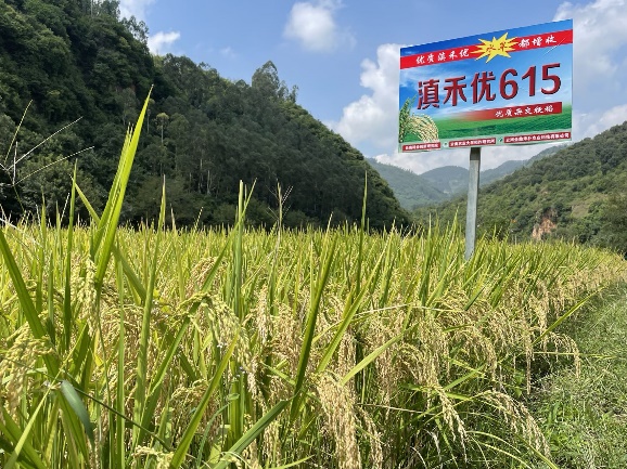 新品种滇禾优615” 2017年通过云南省审定(滇审稻2017017),2022年通过国家审定(国审稻20220301),2019年荣获全国优质稻食味品鉴金奖,多次入选省水稻主导品种。在长江上游粳稻区作一季中稻种植,全生育期177.0天,株高107.0厘米,结实率85.5%,千粒重23.8克,糙米率 83.5%,整精米69.1%,透明度1级,碱消值7.0 级,胶稠度66毫米,直链淀粉含量16.7%。区域试验平均亩产730.8 千克,比对照增产7.5%;生产试验平均亩产677.3千克,比对照增产10.7%